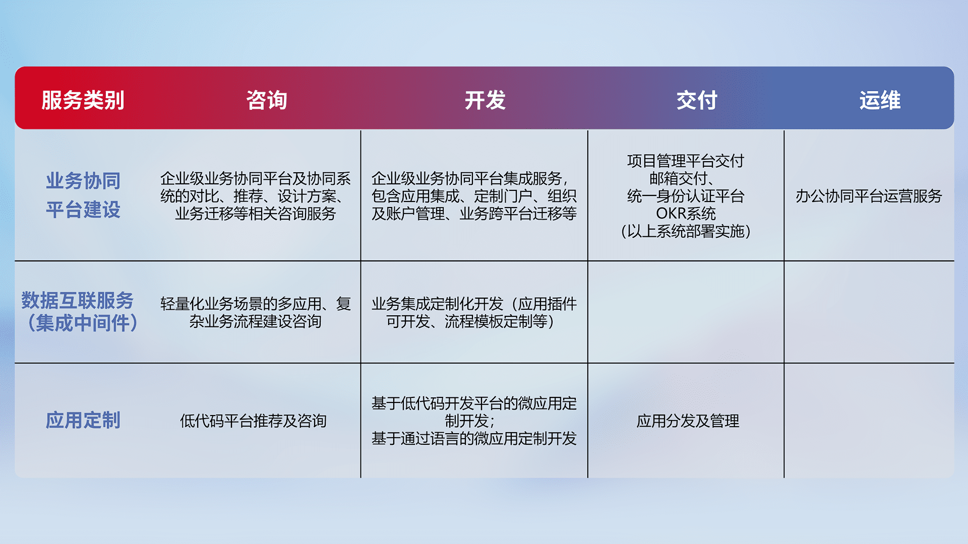针对钉钉、、企微、、IDaas等平台级产品提供产品的规划、、、方案、、、、交付、、定制化开发等服务,,,,实现如统一协同办公、、智能客户服务、、混合会议管理、、、、智能数据查询、、、、等业务场景,,,实现数字化转型。。